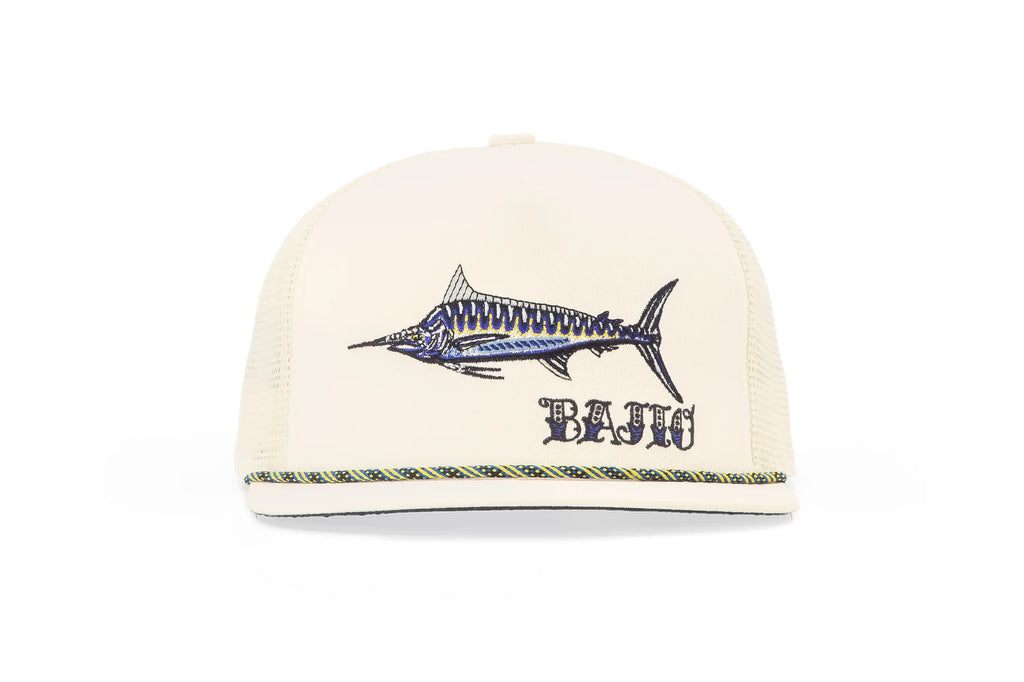 Bajio Black Marlin Flat Brim Twill Trucker - Billfish twill cap. Flat brim marlin emblem headwear.