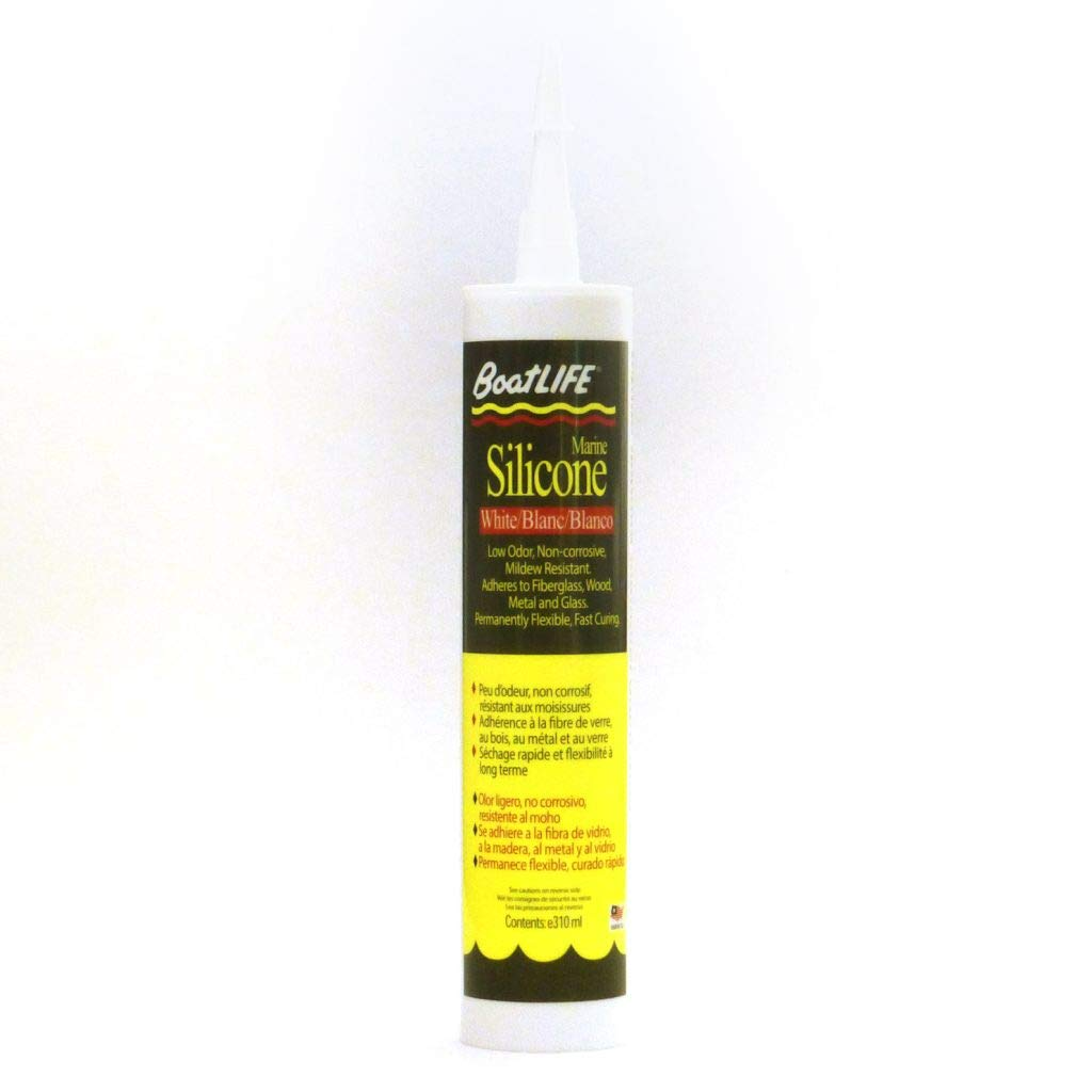 An all-purpose, non-corrosive, non-yellowing, mildew resistant, low-odor, 100% marine high quality silicone sealant. Tack-free in 30 minutes or less. *Fully cured in 24 hours. For use above or below the waterline. Will not shrink, crack, or dry out. Superior flexibility and adhesion to fiberglass, plastic, metal, and wood. Retains flexibility and tensile strength even after years of exposure. Acid free cure will not corrode metal.