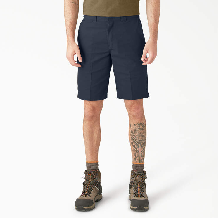 Relaxed-fit work shorts with an 8" inseam, constructed from durable polyester/cotton twill with stain-release finish.