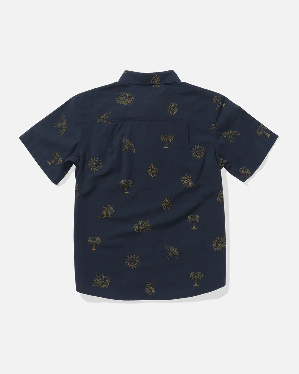 The Salty Crew Good Vibes Boys Short Sleeve Woven shirt in Navy offers a perfect blend of comfort and style with its soft mid-weight cotton slub fabric and lively icon print. Designed with a practical left chest pocket and a contrasting chambray collar stand, it adds a playful touch to any casual outfit. Branded cat eye resin buttons and a soft garment wash ensure a comfortable feel that lasts all day. This shirt is the ideal choice for boys ready to share positive energy wherever they go.